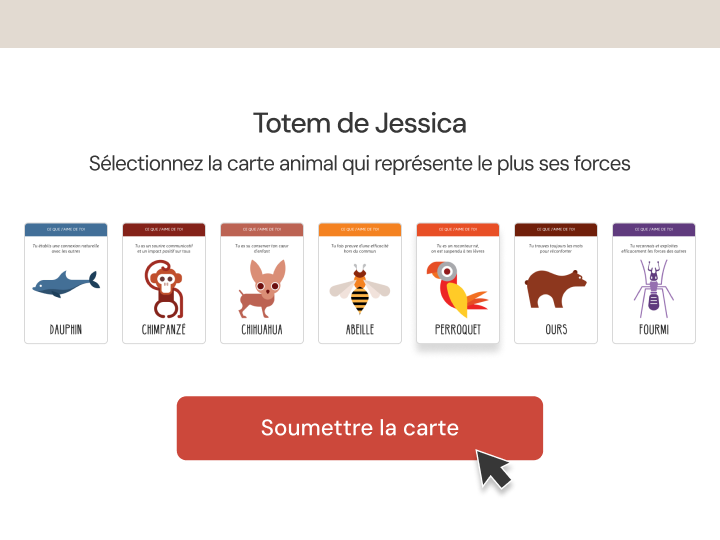 Depuis leur écran, les joueurs sélectionnent une carte Animal qui leur fait penser au destinataire de la carte.
